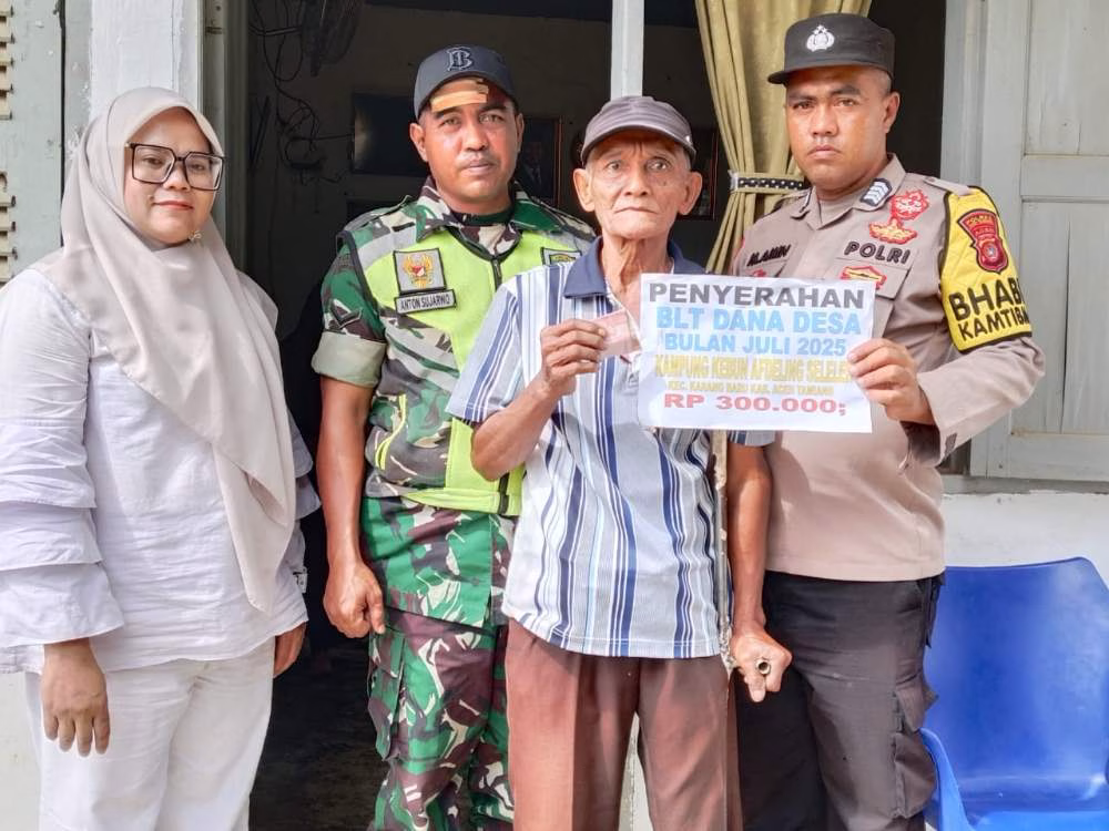 Serda Anton sujarwo Babinsa Koramil 02/Karang Baru, melaksanakan kegiatan pendampingan penyaluran BLT yang bersumber dari Dana Desa Tahun 2025 di Desa Kebun Afdeling Seleleh, Kecamatan Karang Baru, Kabupaten Aceh Tamiang. Kamis (17/07/2025)
