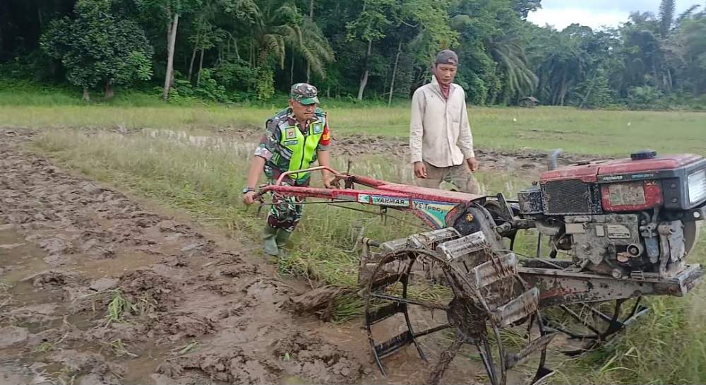 Babinsa Koramil 08/Rantau jajaran Kodim 0117/Aceh Tamiang Serka Subagio melaksanakan Ketahanan Pangan (Hanpangan) dengan membantu membajak sawah menggunakan traktor di lahan milik Tugio, Anggota Kelompok Tani Cinta Damai, di Desa Jamur Jelatang, Kecamatan Rantau, Kabupaten Aceh Tamiang. Senin (12/05/2025)