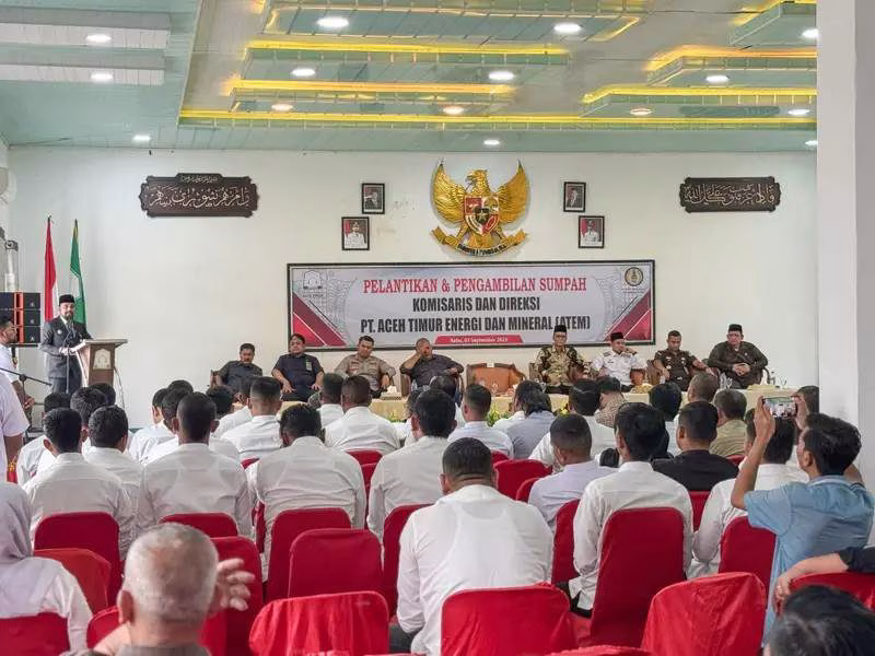 Bupati Aceh Timur, Iskandar Usman Al-Farlaky, resmi melantik Komisaris dan Direksi PT. Aceh Timur Energi dan Mineral (ATEM) pada Rabu, 3 September 2025. Prosesi pelantikan ini berlangsung di Aula Serbaguna Pendopo Bupati Aceh Timur dan dihadiri oleh berbagai tokoh penting, termasuk anggota DPR RI dan Forkopimda Kabupaten Aceh Timur.