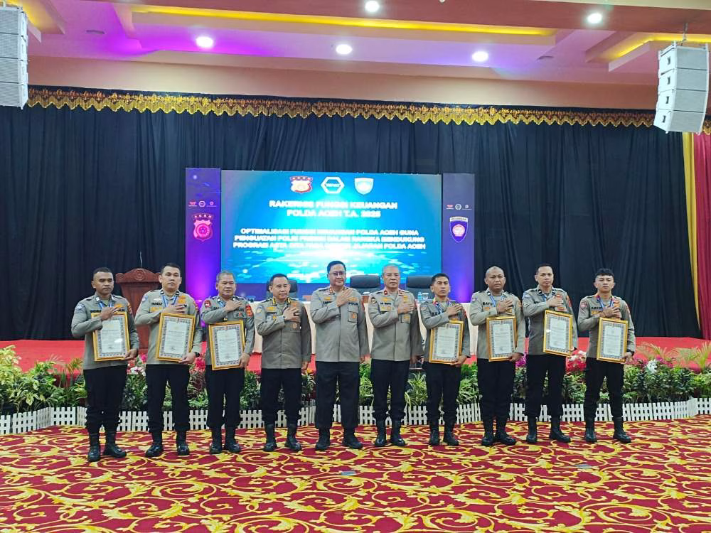 Polres Aceh Tamiang menerima penghargaan Kapolri bagi Bendahara berprestasi T.A 2024 yang diserahkan langsung oleh Kapolda Aceh Irjen Pol. Achmad Kartiko, S.I.K, M.H dalam kegiatan Rakernis Fungsi Keuangan Polda Aceh T.A. 2025 bertempat di Aula Hotel Amel, Banda Aceh. Kamis 7 Agustus 2025.