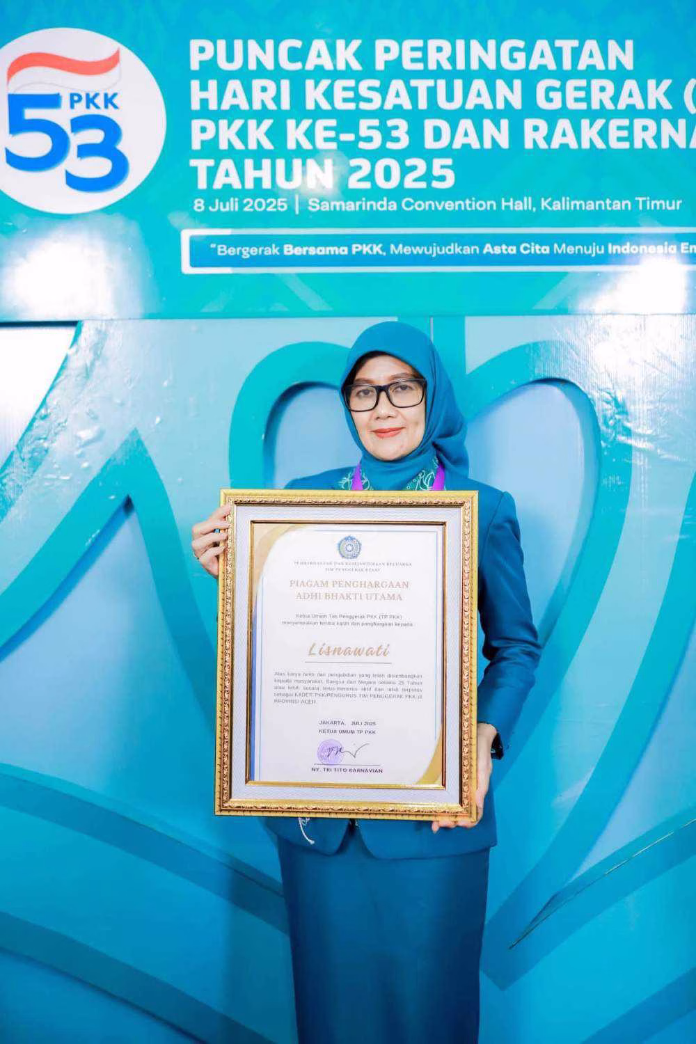Dalam perhelatan puncak Peringatan Hari Kesatuan Gerak PKK ke 53 Tahun 2025 di Samarinda, Kalimantan Timur hari ini, salah seorang kader PKK Aceh Tamiang atas nama Lisnawati yang berasal dari Kecamatan Rantau memperoleh Penghargaan Adhi Bhakti Utama dan pin Emas PKK yang diserahkan secara langsung oleh istri Wakil Presiden, Selvi Gibran Rakabuming. Lisna memperoleh penghargaan tersebut atas komitmen dan dedikasinya mengabdi sebagai kader selama 25 tahun lebih.
