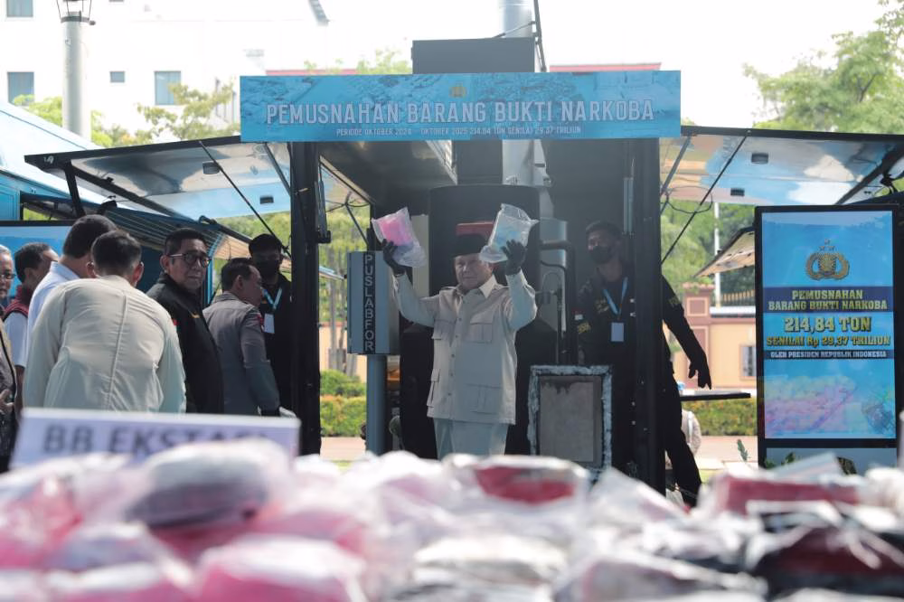Presiden Republik Indonesia Prabowo Subianto menyampaikan apresiasi tinggi kepada jajaran Kepolisian Negara Republik Indonesia (Polri) atas keberhasilan menyita dan memusnahkan total 214,84 ton barang bukti narkoba selama periode satu tahun pemerintahannya, yaitu Oktober 2024 hingga Oktober 2025.