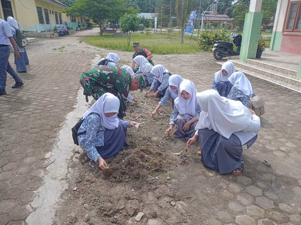 Sertu M. Wartoyo Pada kesempatan ini mendampingi para siswa dalam pembersihan rumput dan sekaligus berinteraksi langsung dengan siswa-siswi.