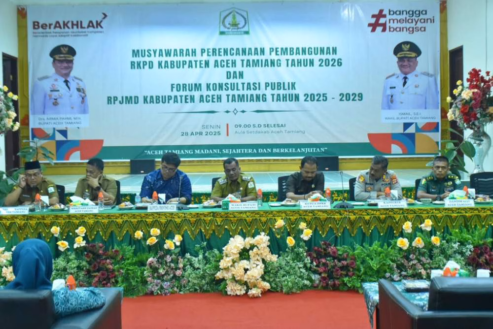 Pemerintah Kabupaten Aceh Tamiang menggelar Musyawarah Perencanaan Pembangunan (Musrenbang) Rencana Kerja Pemerintah Daerah (RKPD) Tahun 2026 serta Forum Konsultasi Publik Rancangan Awal RPJMD Tahun 2025-2029 di Aula Setdakab Aceh Tamiang, Senin (28/4/25).