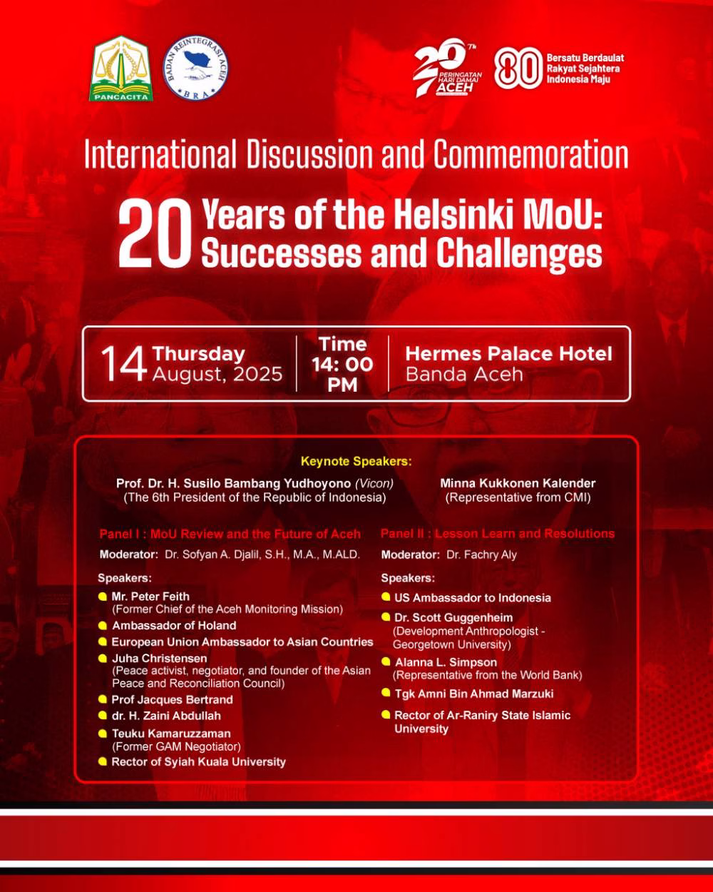 Ratusan tokoh terkemuka Aceh, bersama akademisi, perwakilan LSM internasional, dan diplomat dari 12 negara, akan berkumpul di Banda Aceh dalam rangka Diskusi dan Peringatan Internasional 20 Tahun MoU Helsinki: “Progress and Challenges”. Acara ini akan berlangsung pada Kamis, 14 Agustus 2025, pukul 14.00 WIB di Hermes Palace Hotel, Banda Aceh.