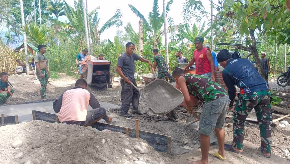 Terlihat suasana kebersamaan yang kuat antara prajurit Satgas TMMD dengan warga setempat. Mereka bahu-membahu menyelesaikan pekerjaan hingga tuntas, mencerminkan semangat gotong royong yang menjadi ciri khas pelaksanaan TMMD di seluruh tanah air.