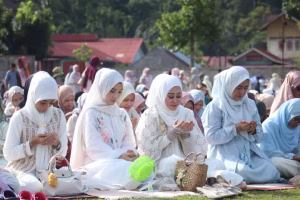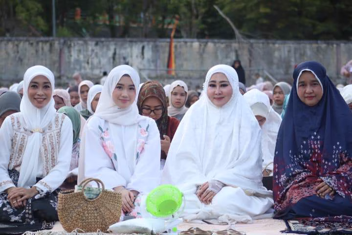Usai salat, ribuan warga masih bertahan di lapangan, duduk beralas tikar, menikmati kebersamaan yang mungkin hanya hadir setahun sekali. Bunda Lisda pun ikut larut, sesekali tertawa lepas bersama warga, sesekali mendengarkan keluh kesah dengan saksama.